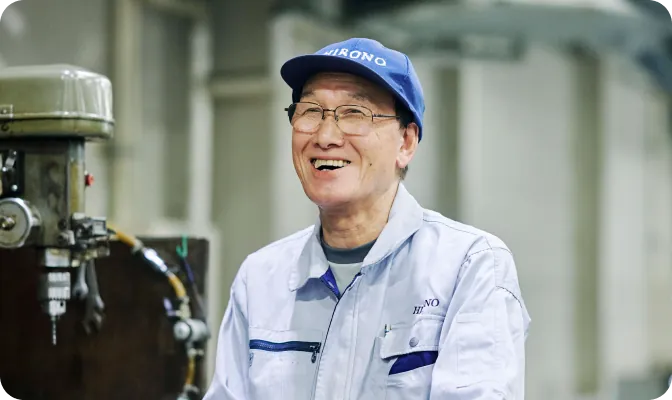 廣野鐵工所では、60歳で一旦退職となりますが、その後本人の希望により長く働ける仕組みがあります。ですから、これまで培った技術や知識を生かし、年齢を重ねても生き生きと働くことができます。現在の最年長社員は75歳。60歳を超えても多くの社員が現場の第一線で活躍しています。「人を大切にする」という理念のもと、誰もが自分らしく働き続けられる──それが廣野鐵工所の強みです。